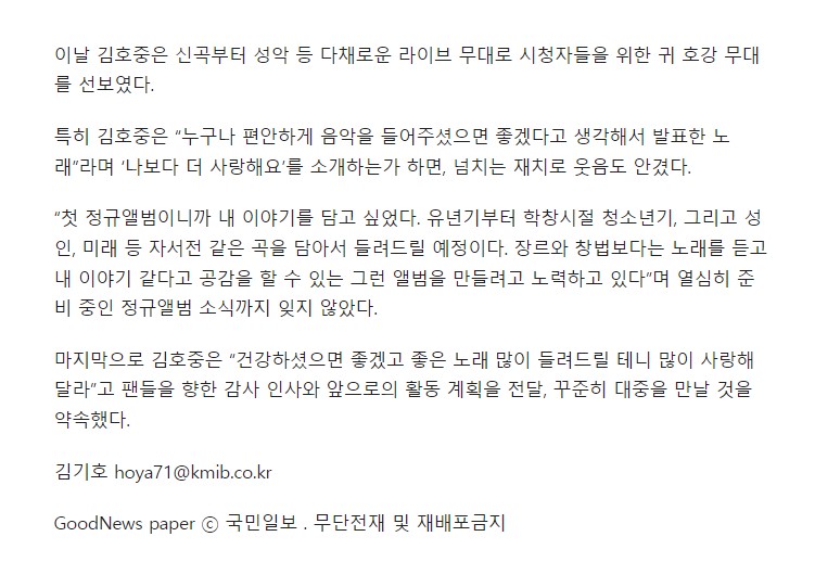 김호중 "정규앨범에는 자서전 같은 노래 담을 예정" (naver.com)